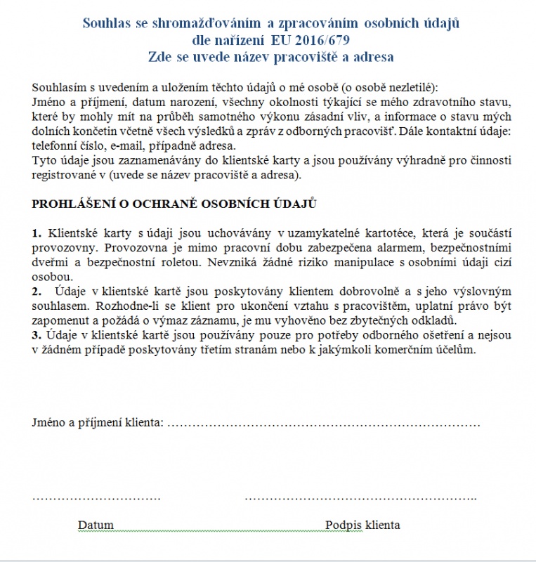 Pokud se rozhodnete vést si záznamy o klientech v papírové podobě, doporučujeme použít v písemné podobě přiložený formulář, který si jen upravte dle svých potřeb a dejte podepsat každému klientovi, o kterém si budete vést záznam v klientské kartě. Takto podepsaný formulář založte na bezpečné místo.